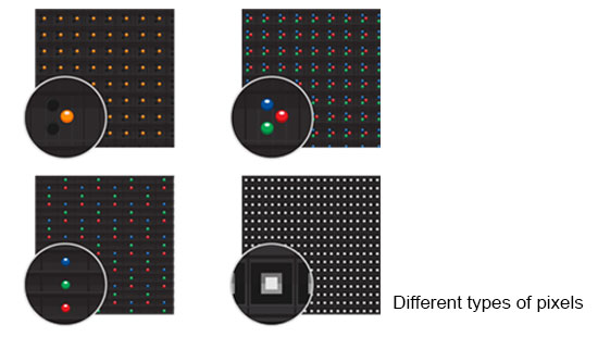 Resim öğelerinin kısaltması olan pikseller, görseller oluşturmak üzere aydınlatan ışık noktalarıdır. bir piksel, tek bir LED'den, aynı renkte birden fazla led'den veya farklı renklerde birden fazla led'den oluşabilir. Onlar elektronik gösterge sisteminin bireysel olarak kontrol edilebilen ve çeşitli parlaklıklarda seviyelerde açılıp kapatılabilen en küçük elemanlarıdır.