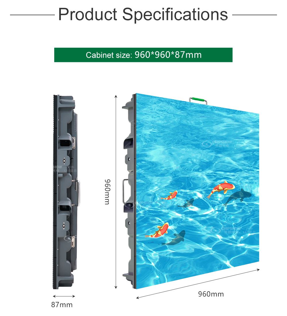 Ön ve arka bakım: Tüm bileşenler (örneğin modüller, sistem kartları ve güç kaynağı üniteleri) ön servisi destekler; bakım sırasında yerden tasarruf etmenizi sağlayabilir; ayrıca duvara monte kurulumu da destekler; İyi su geçirmezlik performansı: Kabinler arasında yan su geçirmezlik teknolojisi uygulanmıştır; tamamen kapalı modüller IP-65 su geçirmezlik derecesine sahiptir ve dış mekan kullanımı için idealdir; Ultra hafif ve ince: Kabinler mükemmel mukavemete sahip magnezyum alaşımından yapılmıştır; her kabin (boyut: 480mm * 640mm) sadece 7,2KG ağırlığındadır; Düşük gürültü: Ekran fan kullanmadan çalışır, gürültü 25Db'nin altındadır; Hızlı kurulum: Bağlantıyı ve kurulumu tamamlamak için hızlı kilitler ve havacılık fişleri kullanılır; çok fazla emek ve zamandan tasarruf edilebilir; Esnek montaj: Küçük ünite boyutu (480mm * 640mm), kullanıcılara farklı tabela/tabela/pano boyutlarının montajında kolaylık sağlar; ayrıca C-Slim büyük boyutlu dolaplarla (boyut: 960mm * 960mm) birleştirmeyi destekler; örneğin, 16:9 en boy oranına sahip bir ekran kolayca birleştirilebilir; Uygulama: Spor müsabakalarında reklam/yayıncılık, emlak reklamcılığı, hükümet/kurumsal imaj tanıtımı vb. gibi çok çeşitli açık hava reklam/yayın projeleri için yaygın olarak kullanılabilir;