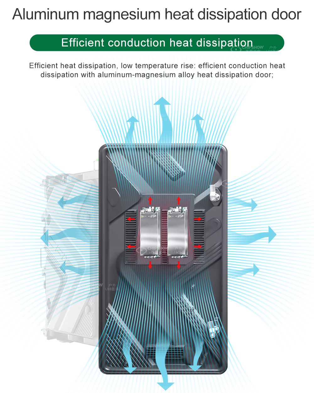 6 Yüksek verimli ısı dağıtımı: Kendi geliştirdiğimiz ısı dağıtım sistemi, kabinin herhangi bir köşesindeki ısının iki kat akım ve negatif basınç yoluyla hızlı bir şekilde dağıtılabilmesini sağlar; bu, LED ekranın ısı dağıtımı sorunları olmadan her zaman normal şekilde çalışabilmesini sağlar.