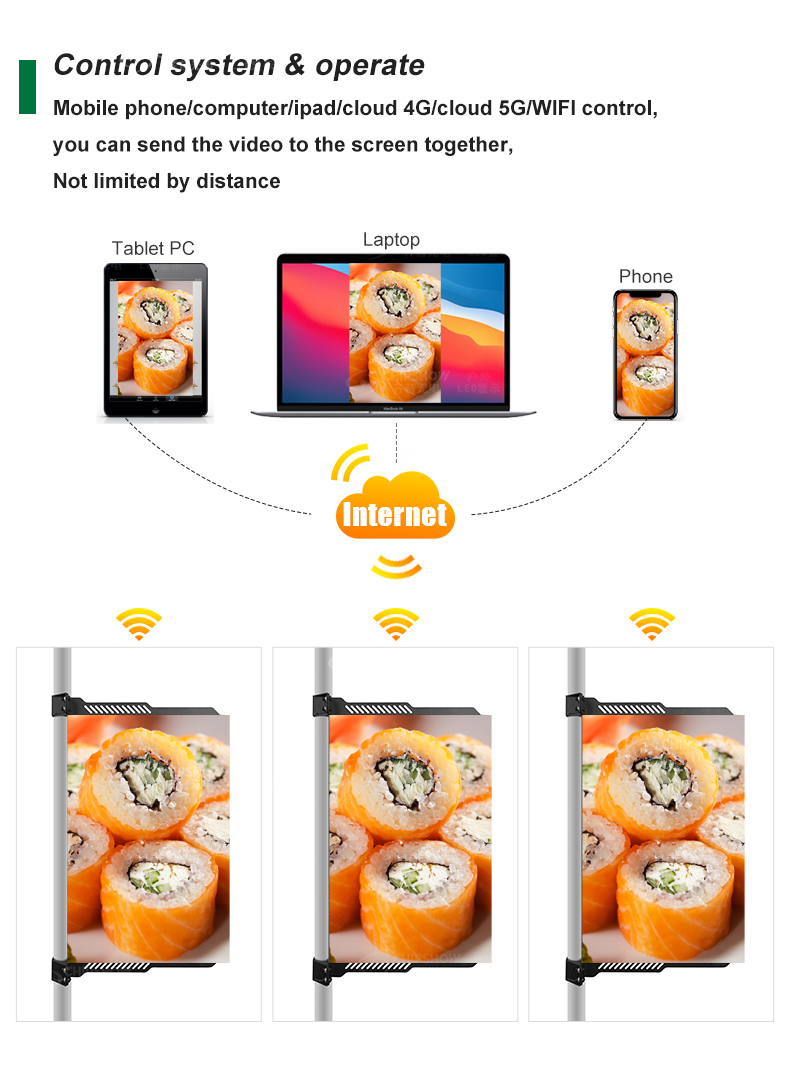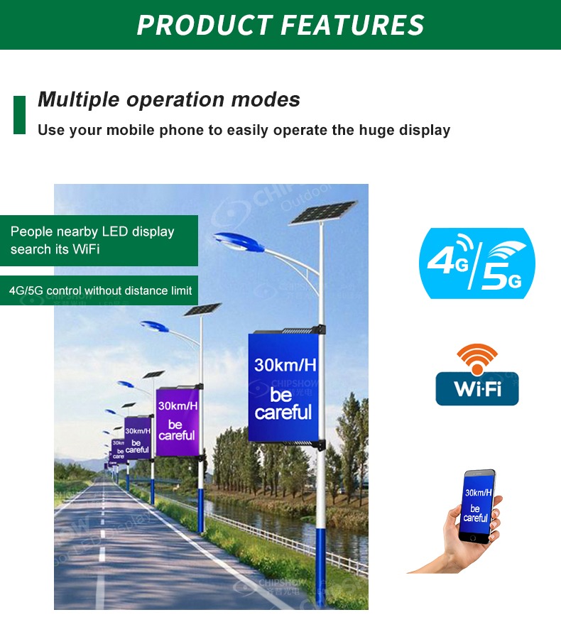4 4G/5G ağ uzaktan kumandası: C-Fit-Pole serisiyle, kutup LED ekranlarının sayısının sınırlı olmadığı büyük ölçekli bir ağ kurabilirsiniz; ayrıca yüksek hızlı veri aktarımı, animasyonların, videoların ve yüksek çözünürlüklü resimlerin gönderilmesini kolaylaştırır;