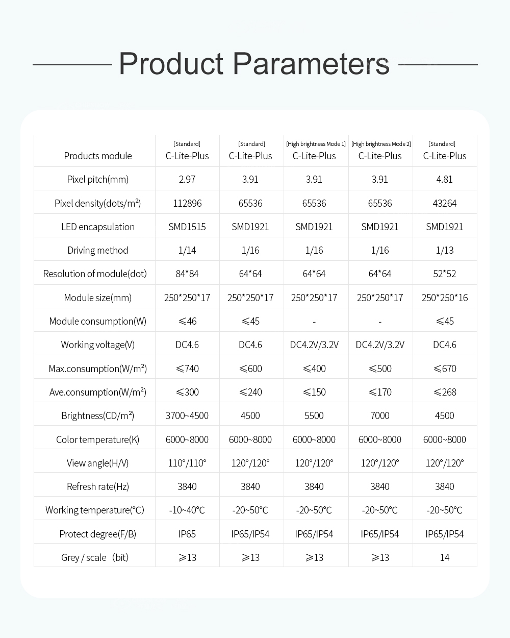 Ürün Özellikleri: 1 Yüksek hassasiyet: Ekranlar yüksek hassasiyetli döküm alüminyum kabinlere sahiptir;2 Hafif, ultra ince: Bir dolabın ağırlığı (boyut: 500*500 mm) 7 kg'dan azdır ve bir dolabın kalınlığı 81 mm'den azdır;3 Hızlı montaj ve sökme: Dolaplar 2 boyutta mevcuttur (500*500mm, 500*1000mm); ve farklı boyutlardaki yukarı ve aşağı dolapları birleştirebilirsiniz;4 Ekranın hızlı bir şekilde sökülebilmesi için her kabinde hızlı sökülebilen kontrol kutusu kullanılmaktadır;5 Ark kilitleri (isteğe bağlı): Ark kilitlerini kullanarak, köşesi 90° açılı, -10° ile 15° arasında değişen ark açılarına sahip büyük ekranları birleştirebilirsiniz;6 Modüller için tek anahtarla kilit açma tasarımı: Sadece dönen bir anahtarla modülü sökebilir ve bakımını yapabilirsiniz;7 Sessiz çalışma: C-Shine-Plus serisi fansız tasarıma sahiptir ve çalışma gürültüsü 40DB'nin altındadır; bu nedenle canlı akustik ve görsel efektleri etkilemez;8 Arka plan ekran optimizasyonu: Görüntüleme efektleri açısından C-Shine-Plus serisi, yüksek yenileme hızı, SLR, 1/3000 saniyelik deklanşör hızı, gölgelenme ve titreme olmaması ile öne çıkar; dolayısıyla sahne arka planları için optimize edilmiş bir görüntüleme çözümüdür;9 Geniş uygulama alanı: C-Shine-Plus serisi, açık ve kapalı sahne ekranlarını içerir; konferanslar, sahne tasarımları, ticaret fuarları ve ürün lansmanları için kapsamlı ekran kiralama çözümleri sunar; açık sahne ekranlarının piksel aralıkları da P1.9, P2.6, P2.97, P3.91 olarak mevcuttur;