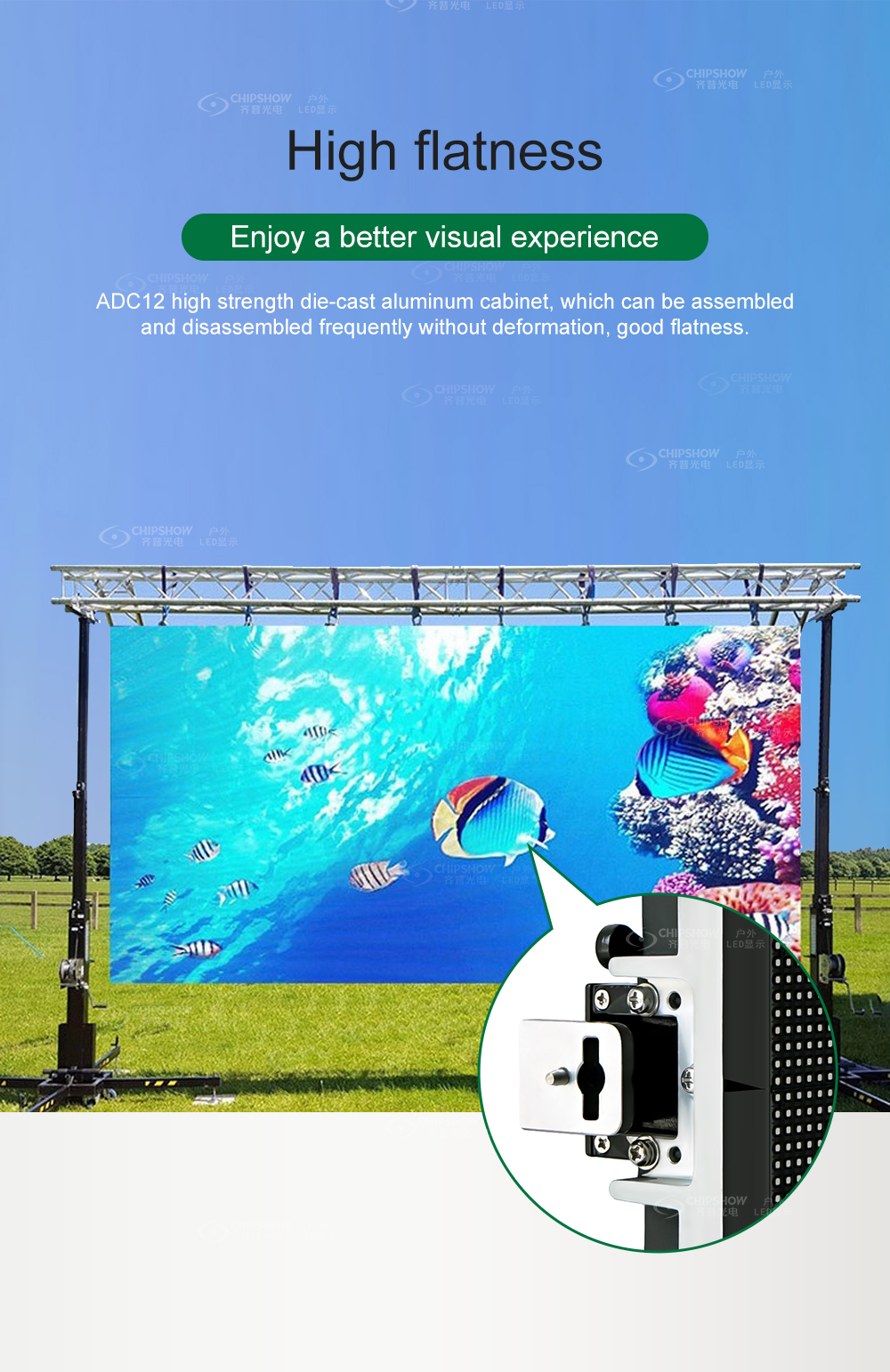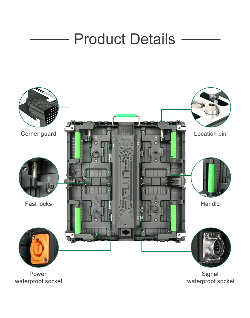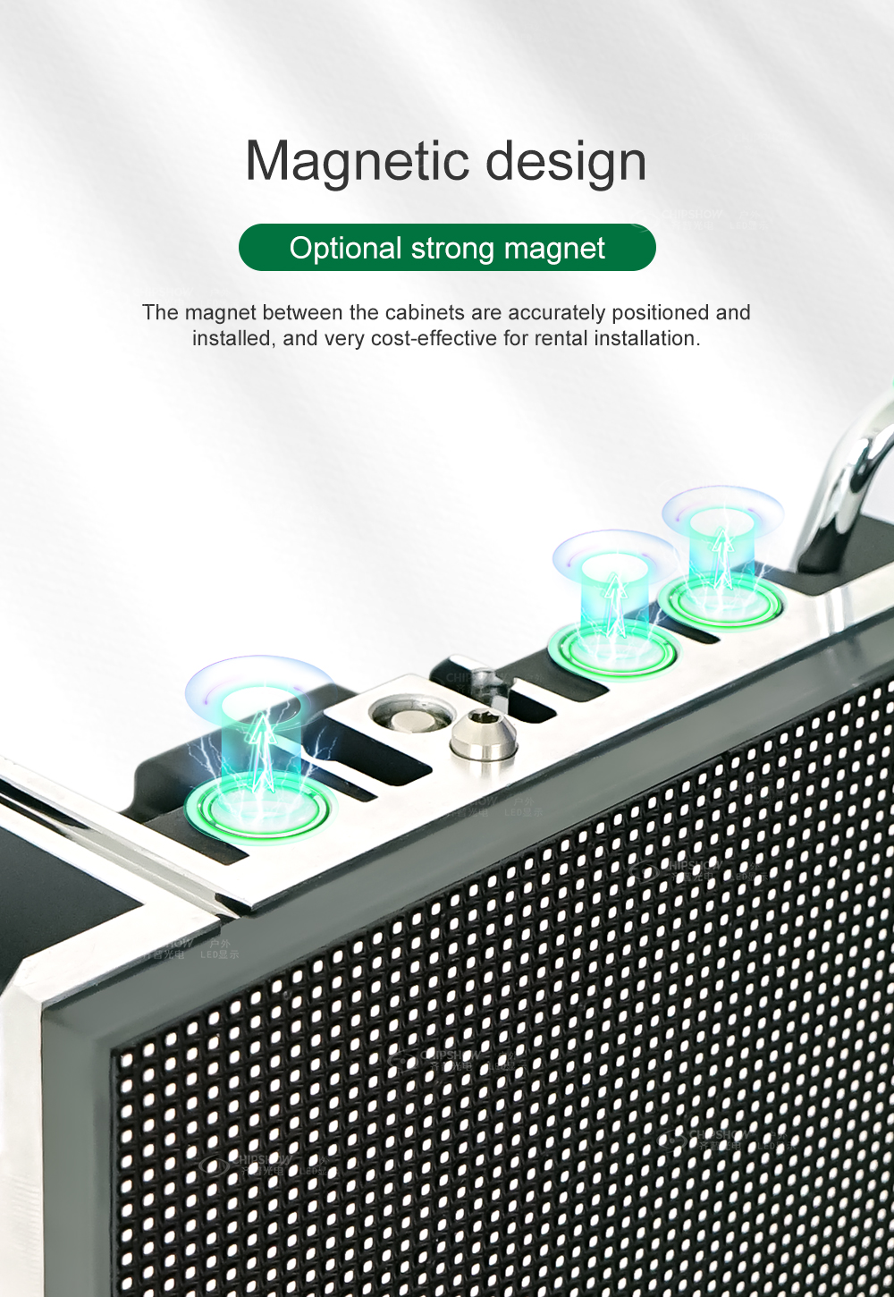 1 İyi düzlük: Ekranlar, kiralama uygulamaları için döküm alüminyum (çekme dayanımı: ADC-12) kabinleri kullanır. Kabinler, deformasyon olmadan sıklıkla monte edilebilir ve sökülebilir;2 Güçlü pratiklik: Dolaplar, kullanışlı vidalı kilitler ve sağlam kulplar gibi minimalist ve pratik bir tasarıma sahiptir.3 Manyetik konum (opsiyonel): Kabinlerin üst ve alt taraflarına, montaj süresini kısaltmak için ekstra manyetik konum pimleri takılabilir;4 Ekonomik: Bu ekran serisi, kiralama amaçlı düşük bütçeli bir ekran çözümüdür ve sağlamlığı ve yüksek performans-fiyat oranı nedeniyle iyi karşılanmaktadır;