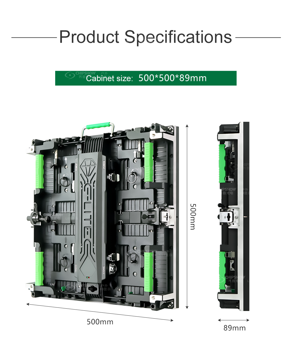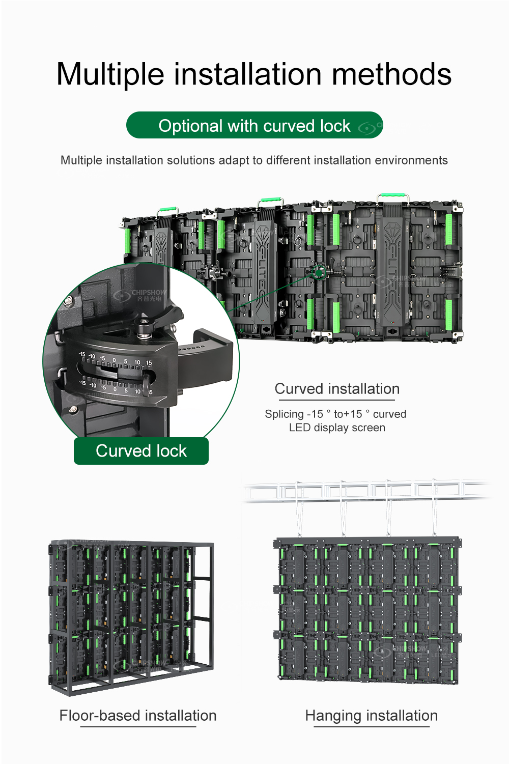 Ürün Özellikleri: 1 Yüksek hassasiyet: Ekranlar yüksek hassasiyetli döküm alüminyum kabinlere sahiptir;2 Hafif, ultra ince: Bir dolabın ağırlığı (boyut: 500*500 mm) 7 kg'dan azdır ve bir dolabın kalınlığı 81 mm'den azdır;3 Hızlı montaj ve sökme: Dolaplar 2 boyutta mevcuttur (500*500mm, 500*1000mm); ve farklı boyutlardaki yukarı ve aşağı dolapları birleştirebilirsiniz;4 Ekranın hızlı bir şekilde sökülebilmesi için her kabinde hızlı sökülebilen kontrol kutusu kullanılmaktadır;5 Ark kilitleri (isteğe bağlı): Ark kilitlerini kullanarak, köşesi 90° açılı, -10° ile 15° arasında değişen ark açılarına sahip büyük ekranları birleştirebilirsiniz;6 Modüller için tek anahtarla kilit açma tasarımı: Sadece dönen bir anahtarla modülü sökebilir ve bakımını yapabilirsiniz;7 Sessiz çalışma: C-Shine-Plus serisi fansız tasarıma sahiptir ve çalışma gürültüsü 40DB'nin altındadır; bu nedenle canlı akustik ve görsel efektleri etkilemez;8 Arka plan ekran optimizasyonu: Görüntüleme efektleri açısından C-Shine-Plus serisi, yüksek yenileme hızı, SLR, 1/3000 saniyelik deklanşör hızı, gölgelenme ve titreme olmaması ile öne çıkar; dolayısıyla sahne arka planları için optimize edilmiş bir görüntüleme çözümüdür;9 Geniş uygulama alanı: C-Shine-Plus serisi, açık ve kapalı sahne ekranlarını içerir; konferanslar, sahne tasarımları, ticaret fuarları ve ürün lansmanları için kapsamlı ekran kiralama çözümleri sunar; açık sahne ekranlarının piksel aralıkları da P1.9, P2.6, P2.97, P3.91 olarak mevcuttur;