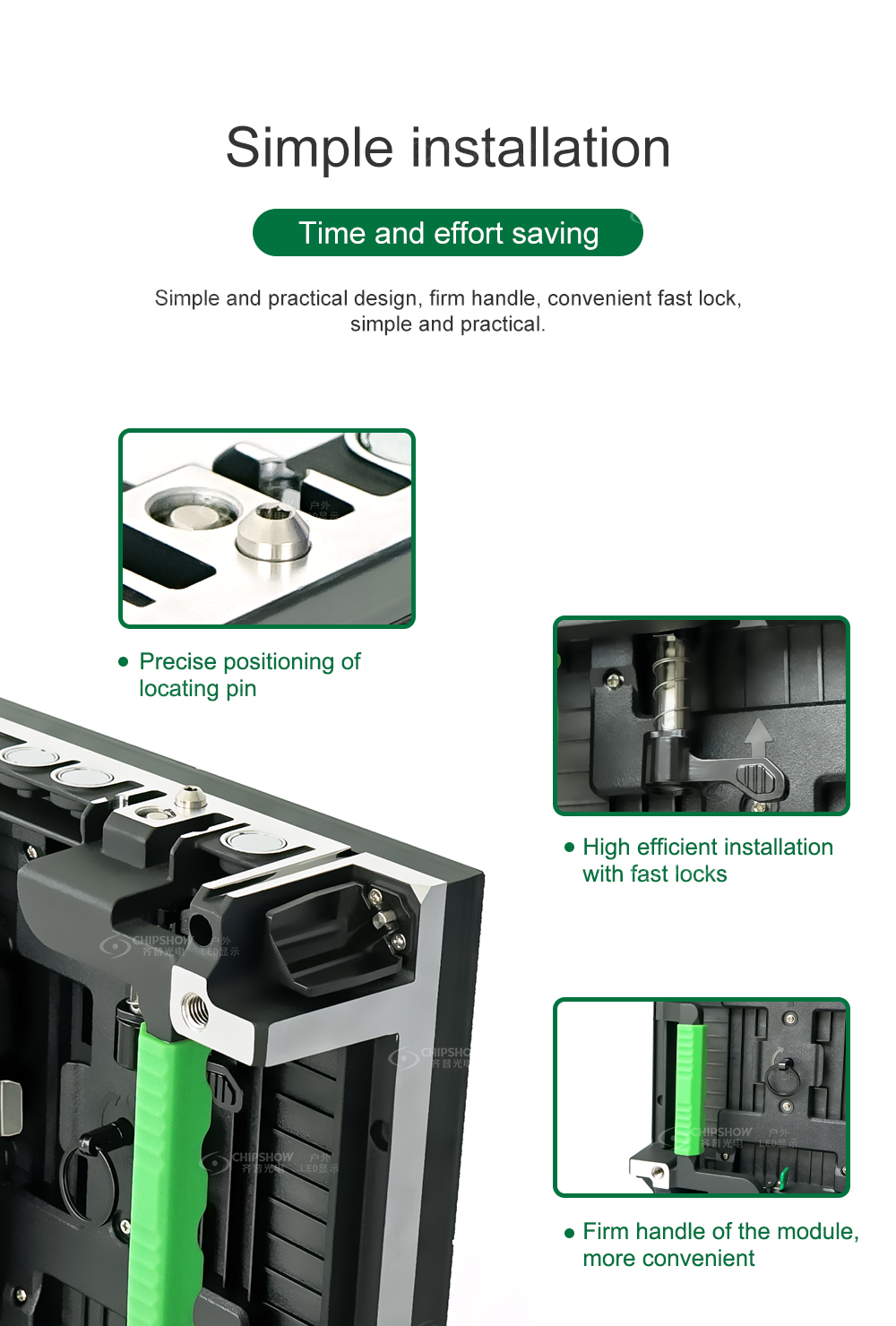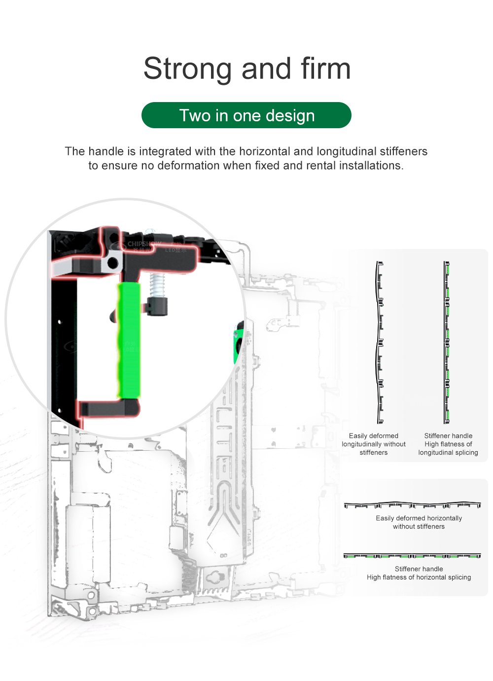 1 İyi düzlük: Ekranlar, kiralama uygulamaları için döküm alüminyum (çekme dayanımı: ADC-12) kabinleri kullanır. Kabinler, deformasyon olmadan sıklıkla monte edilebilir ve sökülebilir;2 Güçlü pratiklik: Dolaplar, kullanışlı vidalı kilitler ve sağlam kulplar gibi minimalist ve pratik bir tasarıma sahiptir.3 Manyetik konum (opsiyonel): Kabinlerin üst ve alt taraflarına, montaj süresini kısaltmak için ekstra manyetik konum pimleri takılabilir;4 Ekonomik: Bu ekran serisi, kiralama amaçlı düşük bütçeli bir ekran çözümüdür ve sağlamlığı ve yüksek performans-fiyat oranı nedeniyle iyi karşılanmaktadır;