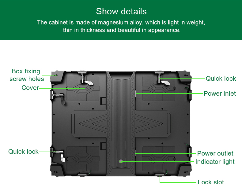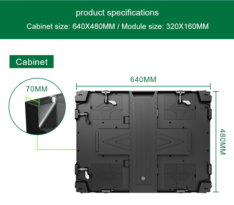 • 640x480mm kabin ebadı, çeşitli 4:3 ve 16:9 LED büyük ekranlarla birlikte monte edilebilir, doğrudan duvara monte edilebilir, yerden ve işçilikten tasarruf sağlar.