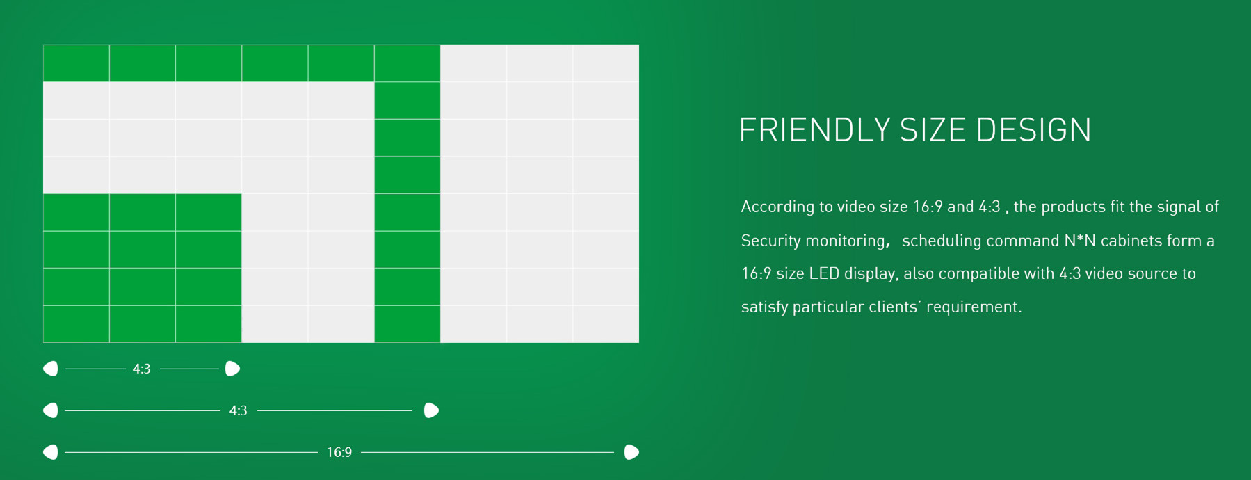 16:9 ve 4:3 video boyutuna göre ürün, güvenlik izleme sinyaline uygundur, komut kabinlerinin programlanması 16:9 boyutlu bir LED ekran oluşturur ve ayrıca müşterilerin gereksinimlerini karşılamak için 4:3 video kaynağıyla da uyumludur.