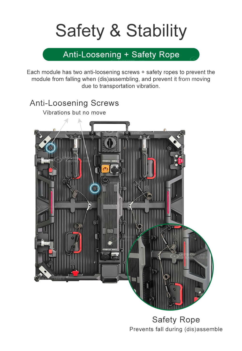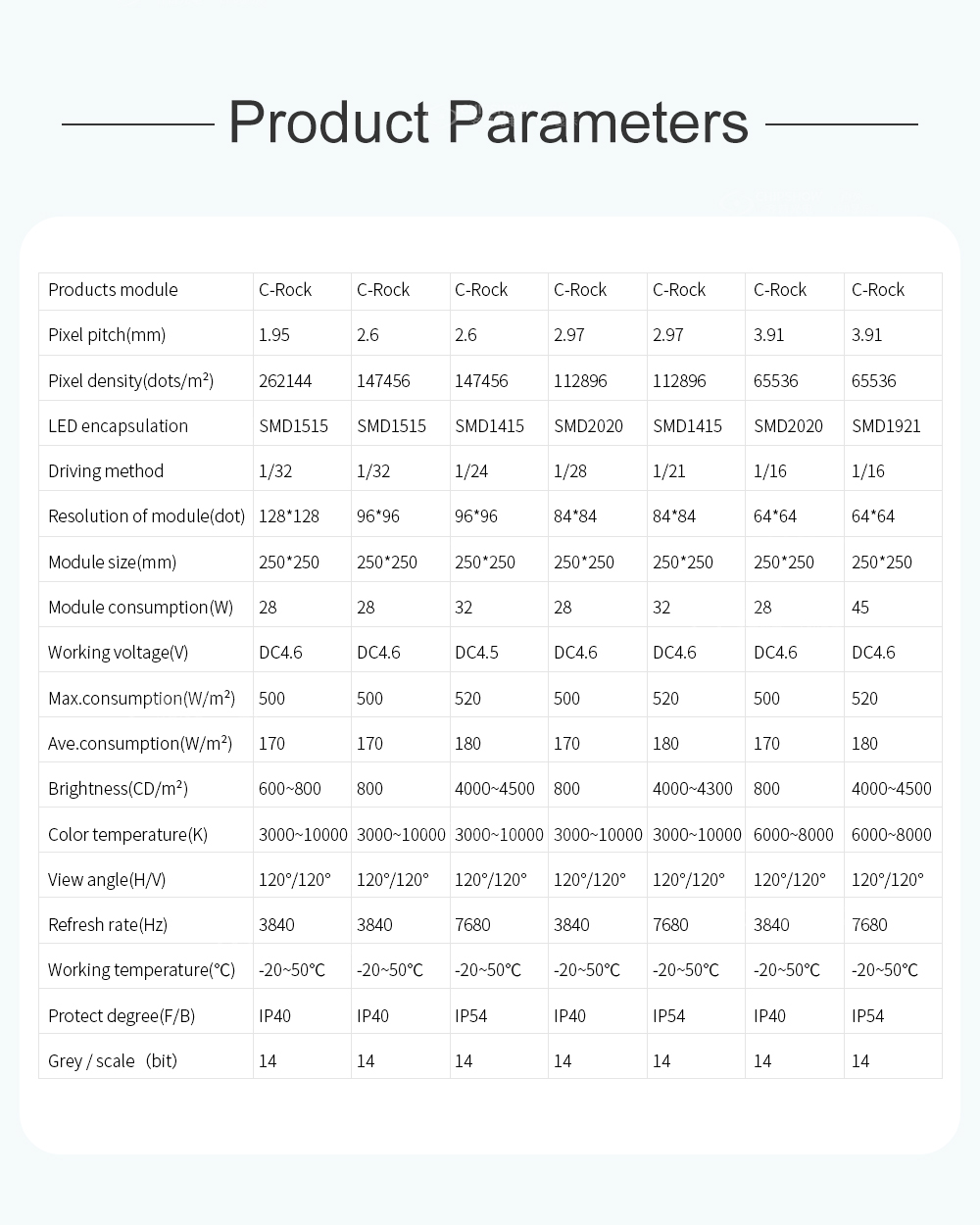10 İç ve dış mekan kullanımına uygundur: Sahne performansları, konferanslar ve etkinlikler için kapsamlı bir LED ekran çözümü olan C-Rock serisi, iç mekan kullanımı için 1,95 mm, 2,604 mm ve 3,91 mm piksel aralıklarında mevcuttur; ve dış mekan kullanımı için C-Rock serisi, 2,604 mm, 2,97 mm, 3,9 mm ve 4,8 mm piksel aralıklarında mevcuttur;