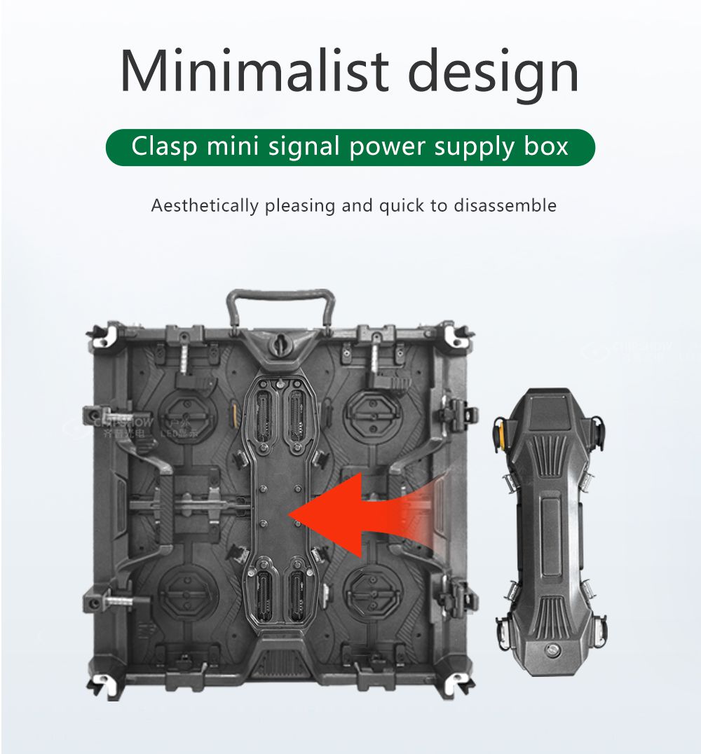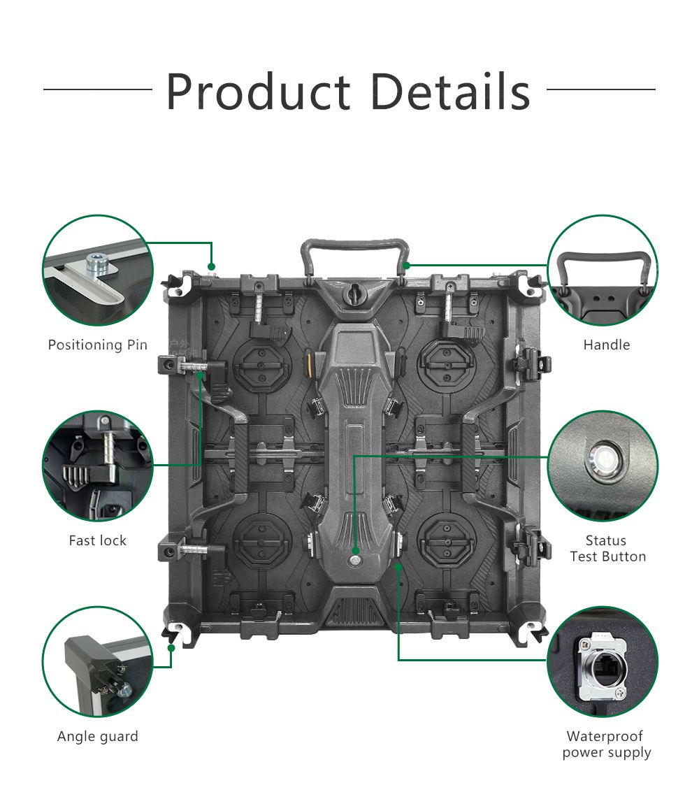 1 İyi düzlük: Ekranlar, kiralama uygulamaları için döküm alüminyum (çekme dayanımı: ADC-12) kabinleri kullanır. Kabinler, deformasyon olmadan sıklıkla monte edilebilir ve sökülebilir;2 Güçlü pratiklik: Dolaplar, kullanışlı vidalı kilitler ve sağlam kulplar gibi minimalist ve pratik bir tasarıma sahiptir.3 Manyetik konum (opsiyonel): Kabinlerin üst ve alt taraflarına, montaj süresini kısaltmak için ekstra manyetik konum pimleri takılabilir;4 Ekonomik: Bu ekran serisi, kiralama amaçlı düşük bütçeli bir ekran çözümüdür ve sağlamlığı ve yüksek performans-fiyat oranı nedeniyle iyi karşılanmaktadır;