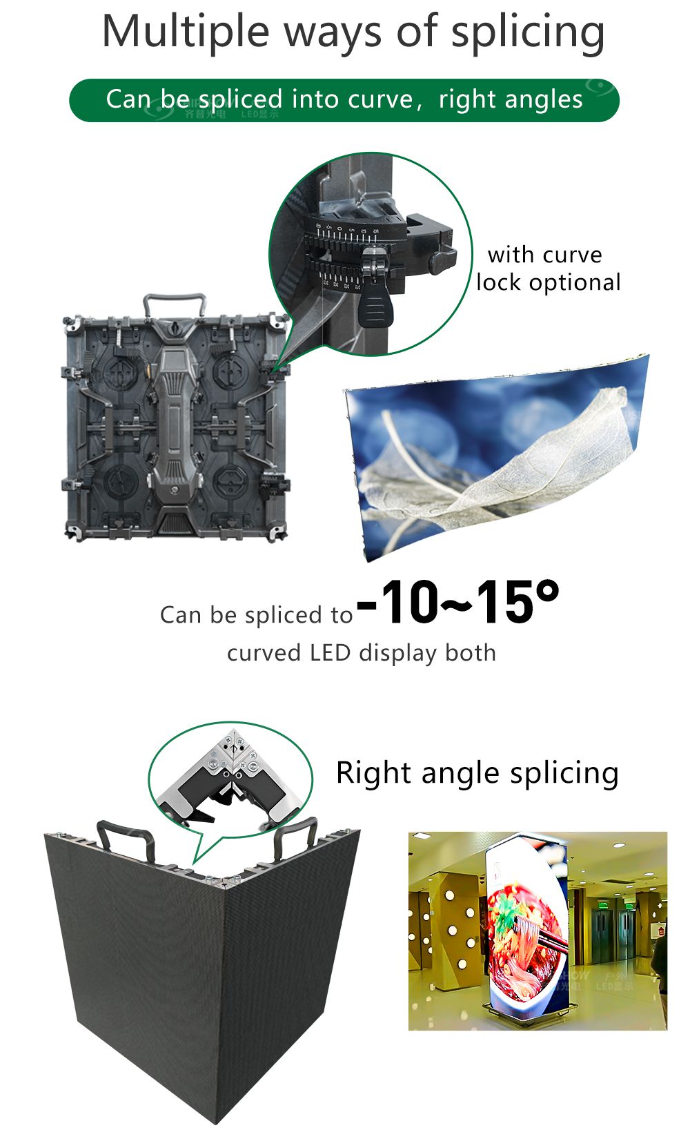 1 Dolaplar döküm alüminyumdan yapılmıştır ve ultra hafif ve ultra ince bir tasarıma sahiptir; dolabın kalınlığı (boyut: 500*500mm) sadece 87 mm'dir ve dolap ağırlığı 6,8 kg'dan düşüktür; 2 Kavisli dolaplar sol ve sağ taraftan düzlemsel dolaplarla birleştirilebilir; bu arada, C-Arc serisi C-Shine serimizle (P2.604) birlikte birleştirilebilir; böylece daha fazla şekle sahip dolaplar yapabilirsiniz; 3 İçbükey-dışbükey kavisli LED ekran tipi olan C-Arc serisinin sağladığı kavis açıları (iç ve dış ark açıları) -30° ile 30° arasında değişmektedir. 4 Modüller, özel yerleşim tasarımlarına sahip yumuşak PCB kartlarını benimser; bu, ekranın ark yüzeyinin her zaman pürüzsüz olmasını sağlar; 5 Kabinler fansız bir tasarıma sahiptir; ekran çalışırken oluşan gürültü her zaman 40DB'nin altındadır; bu, canlı görsel ve akustik efektleri etkilemez; 6 C-Arc serisi HD görsel efektler sunar; beyaz dengesi ve nokta nokta renk kalibrasyonu teknolojisi sayesinde görüntülerin yüksek düzeyde düzgünlüğü ve tutarlılığı garanti edilir; 7 3 adet dolap 90°'lik bir yay oluşturacak şekilde bir araya getirilerek bir paravan oluşturulabilir; yani 12 adet dolap dairesel bir paravan oluşturabilir; 8 Kavisli LED ekranlar olarak, C-Arc serisi kiralama hizmetleri için sahne ekranları olarak yaygın olarak kullanılır ve esas olarak ticaret fuarlarında ve iç mekan sahne gösterilerinde uygulanır; ayrıca, iç mekan sabit ekranlar olarak da uygulanabilir;