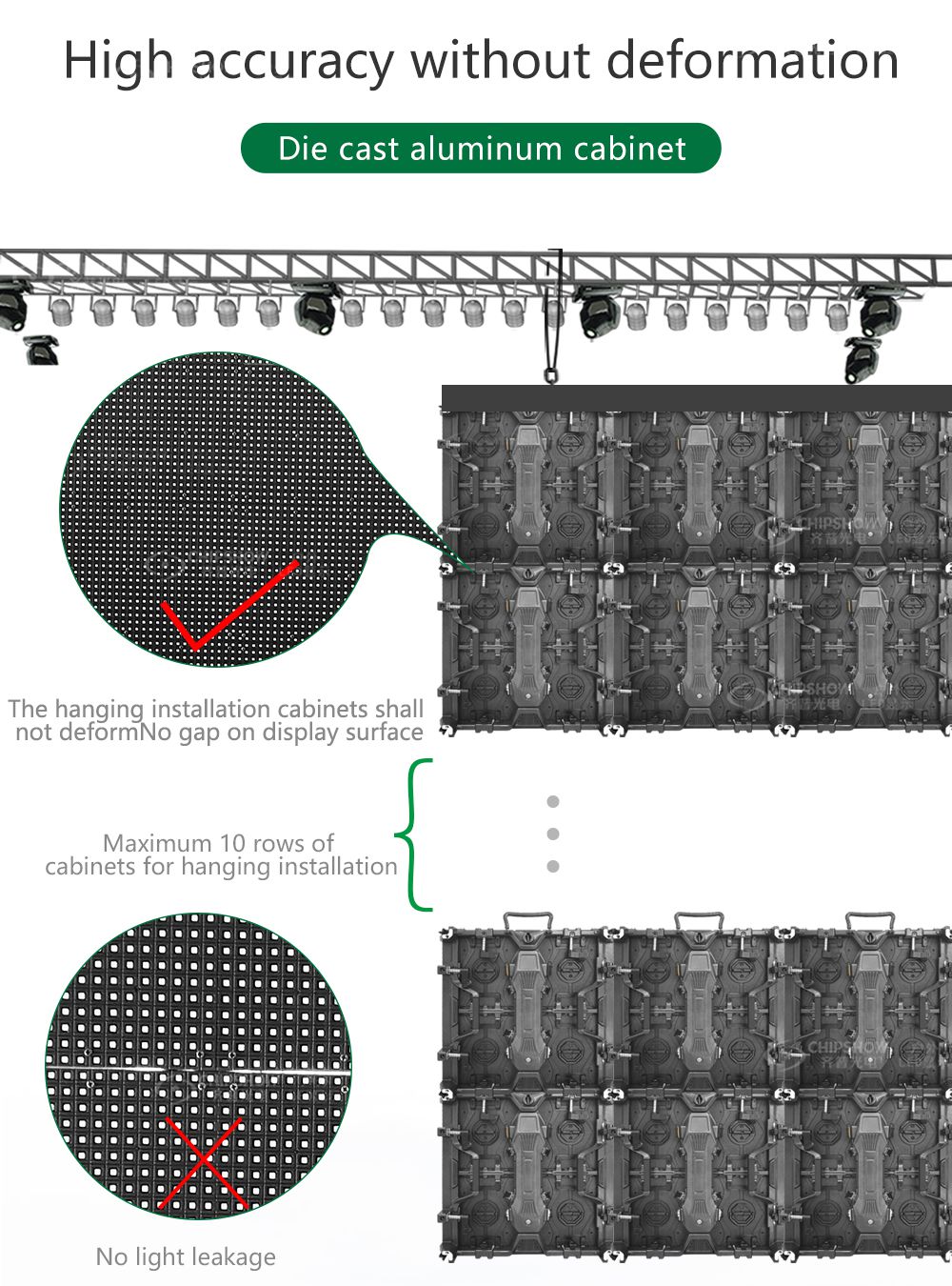 1 Mükemmel düzlük, deformasyona karşı yüksek direnç: C-Shine-Plus (GOB) serisi, iyi düzlük ve deformasyona karşı iyi direnç gösteren yüksek mukavemetli alüminyum alaşım sınıfı: ADC-12 döküm alüminyum kabinleri benimser; ekran sıklıkla monte edilip sökülse bile kabinler yine de düz kalabilir;