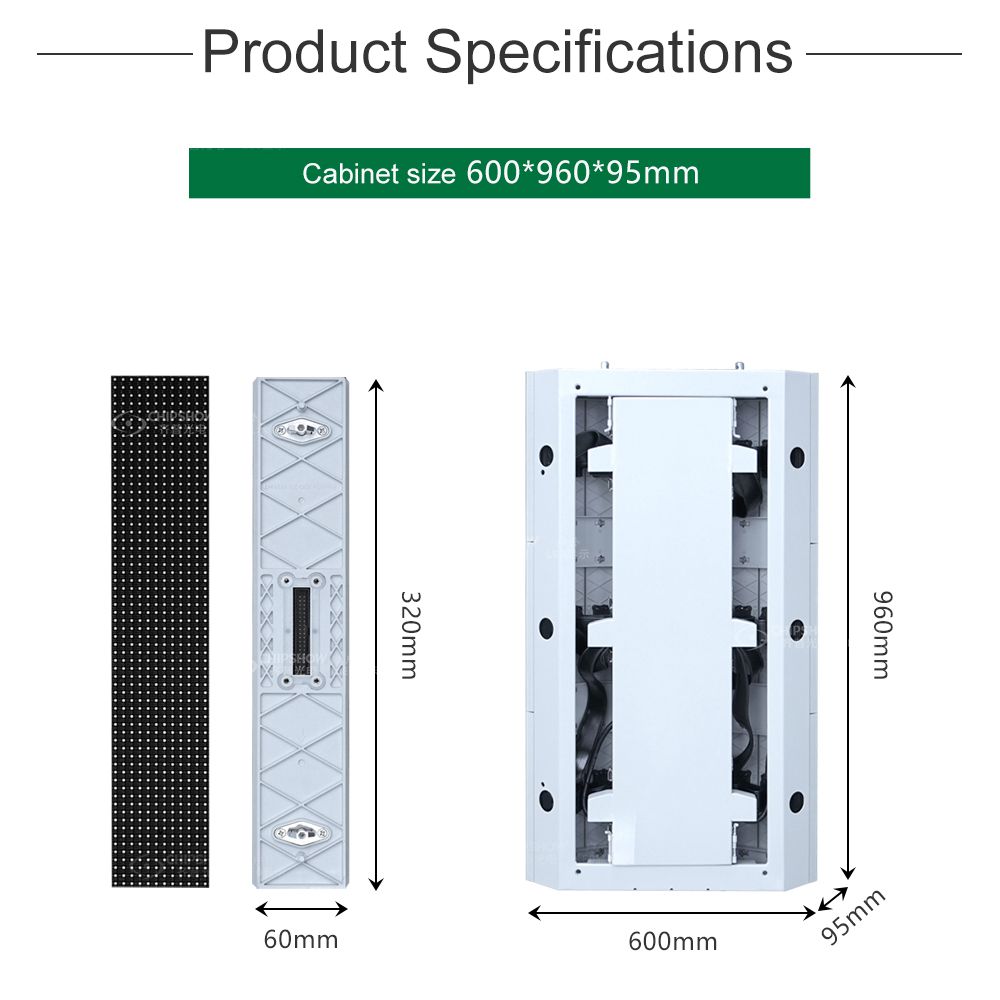 Çözünürlük oranı, boyut, Modül miktarı: 120*192 Nokta, 600*960*95mm, 10X3