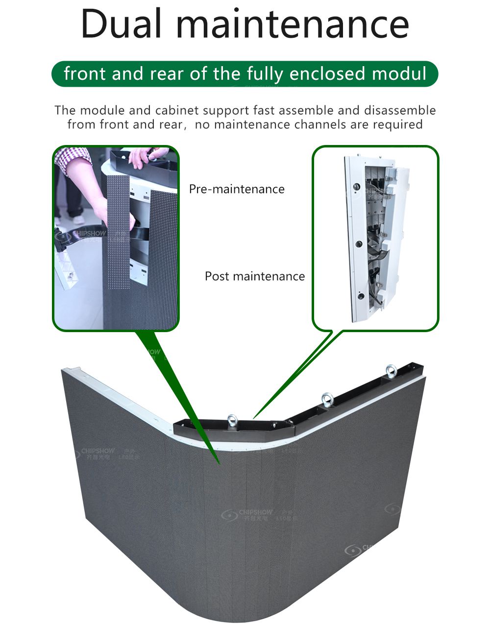 3 İkili servis (ön ve arka bakım): Hem kabinler hem de modüller, her türlü kurulum gereksinimlerini karşılamak için ön ve arka bakım tasarımını benimser;