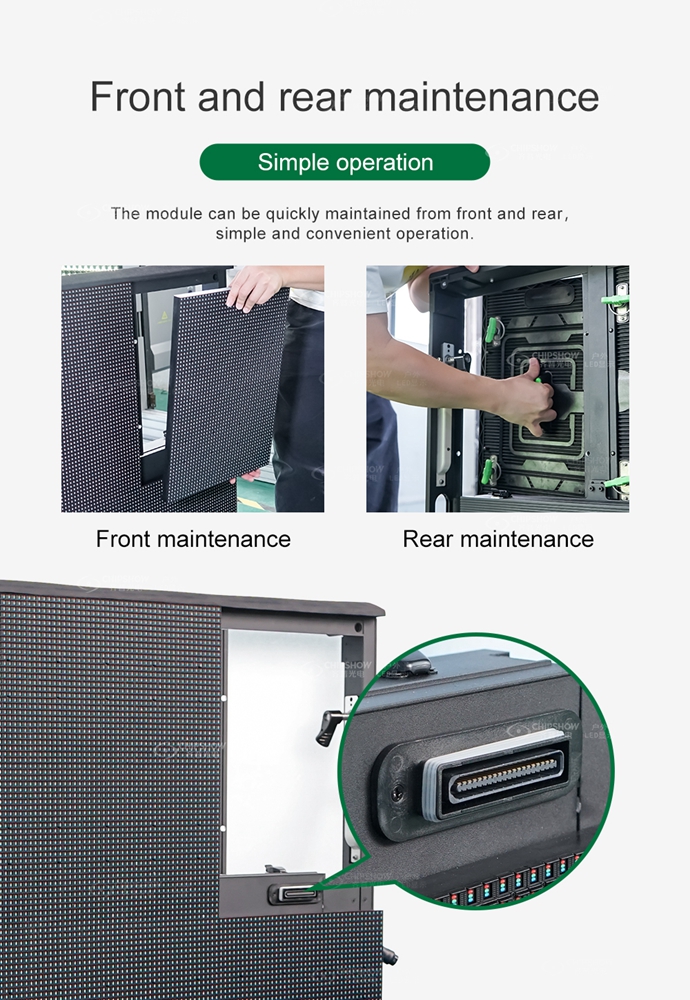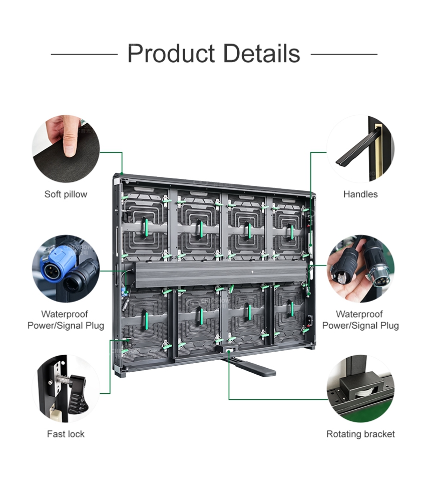◙ Kabin, stadyum LED ekranının verimli montajı için 90° dönebilen bir braket ve sol ve sağ hızlı kilitlerle birlikte gelir.