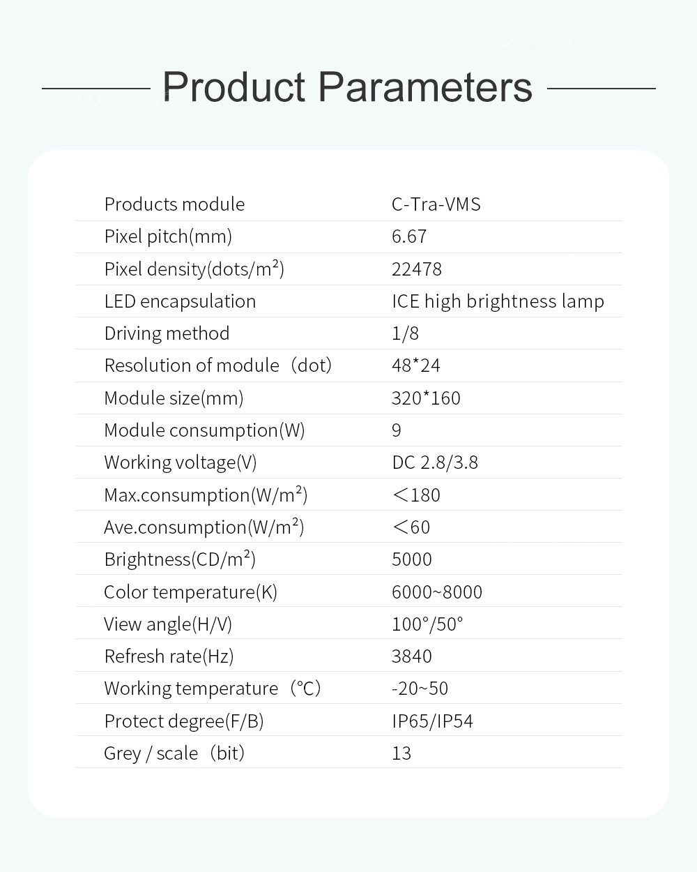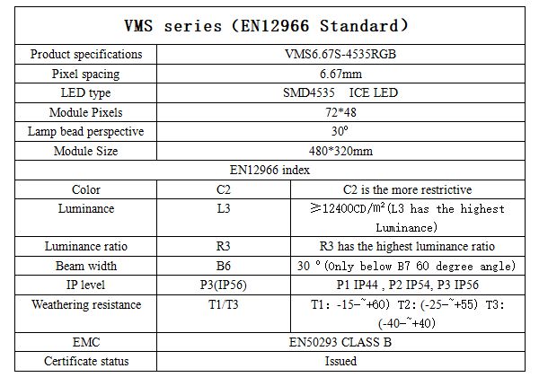 Özellikler: 1 Yüksek parlaklık - her LED modülünde optik lens filtreli LED boncuklar bulunur; parlaklık seviyesi 8000 CD /㎡'ye ulaşabilir; 2 Enerji tasarrufu – benzer özelliklere sahip LED ekranlarla karşılaştırıldığında bu seri %65'ten fazla enerji tasarrufu sağlayabilir; 3 Ultra güçlü nüfuz: saatte 120 KM hızla, 210 metreden daha uzak bir mesafede veya sisli havalarda sürüş yapmalarına rağmen sürücülere net görüntüler gösterebilir; 4 Yüksek koruma - her LED modülü ve her kabin tamamen kapalıdır ve ekranın hem önü hem de arkası IP65 derecelidir; 5 Hızlı bakım – basit ve hızlı takma ve sökme tasarımı, kurulum ve bakım sırasında size önemli ölçüde zaman kazandıracaktır; 6 Ultra hafif: Tamamlanmış her kabinin ağırlığı 35 kg/m2'den azdır, bu nedenle destekleyici yapının sağlamlığı konusunda katı bir gerekliliğe sahip değildir ve otoyollarda büyük LED ekranlar olarak oldukça uygundur; 7 Yüksek güvenilirlik: Her türlü kötü hava koşulunda ekranın güvenilirliğini ve stabilitesini sağlamak için ekranda yüksek kaliteli LED boncuklar, IC ve güç kaynağı üniteleri kullanılır;