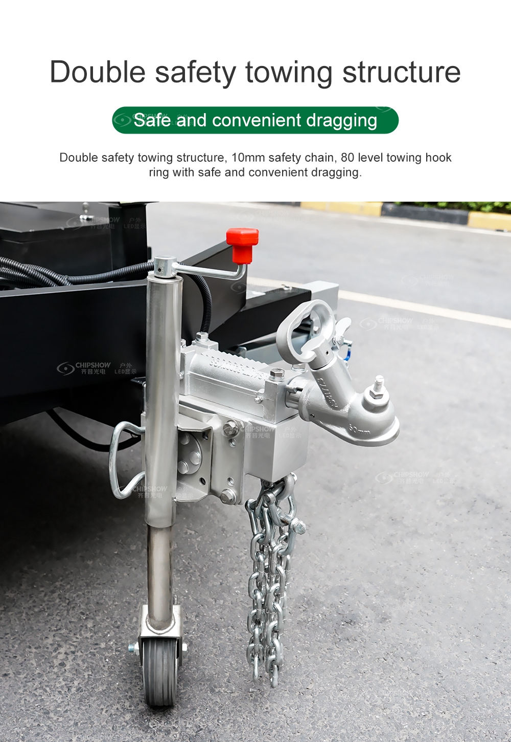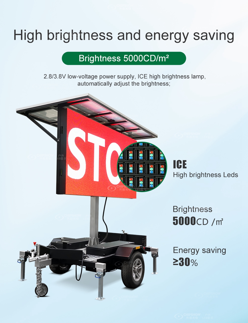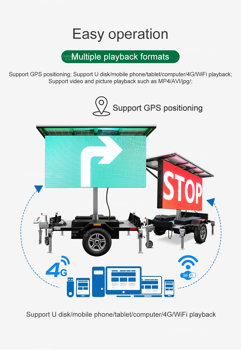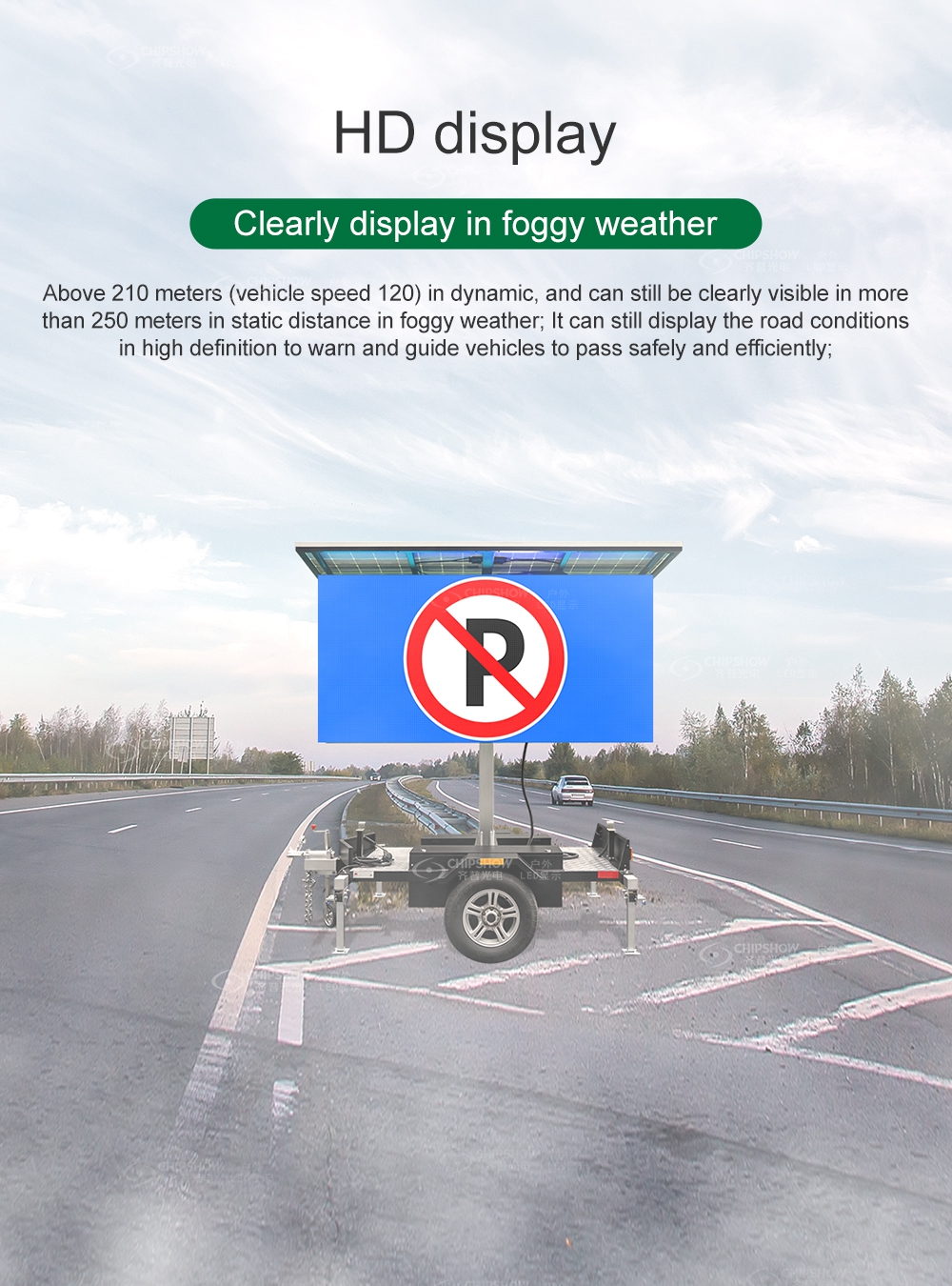 1. Yüksek parlaklık ve enerji tasarrufu: 3,2/4,2V düşük voltajlı güç kaynağı, 4535 3'ü 1 arada yüksek parlaklıkta LED'ler, parlaklık ≥ 10000CD/㎡; Parlaklık otomatik olarak ayarlanabilir; 2. HD ekran: Dinamik olarak 210 metrenin üzerinde (araç hızı 120) ve sisli havalarda statik mesafeden 250 metrenin üzerinde net bir şekilde görülebilmektedir; Araçları güvenli ve verimli bir şekilde geçmeleri konusunda uyarmak ve yönlendirmek için yol koşullarını hala yüksek çözünürlükte görüntüleyebilir; 3. Verimli ısı dağılımı: Kabinde büyük akışlı negatif basınçlı ısı dağılımı, verimli ısı tahliyesi ve LED ekranın daha kararlı çalışması; 4. Solar şarj +9.6KWH büyük kapasiteli pil, yılın 365 günü LED ekranı sürekli olarak çalıştırabilir; 5. Hidrolik kaldırma+döner yapı; Tüm ekran, bilgileri herhangi bir yükseklik ve açıda oynatmak için 1M yükseklikte ve 360 ​​° 'de gezinir. 6. Çift emniyetli çekme yapısı, 10mm emniyet zinciri, güvenli ve rahat sürükleme özelliğine sahip 80 seviyeli çekme kancası halkası. 7. 7 çekirdekli sinyal konektörü, tüm araçtaki EMARK sertifikalı römork göstergesini, fren lambasını, dönüş lambasını ve yan lambayı kontrol edebilir. 8. GPS konumlandırmayı destekleyin; U disk/cep telefonu/tablet/bilgisayar/4G/WiFi oynatmayı destekleyin; MP4/AVI/jpg/ gibi video ve resim oynatmayı destekleyin; 9. Esas olarak yüksek hızlı portal ve F çerçeveli trafik rehberliği için kullanılır; Yol onarım araçları, temizlik araçları, temizlik araçları ve diğer yol işletme araçları için güvenlik uyarı işaretleri.