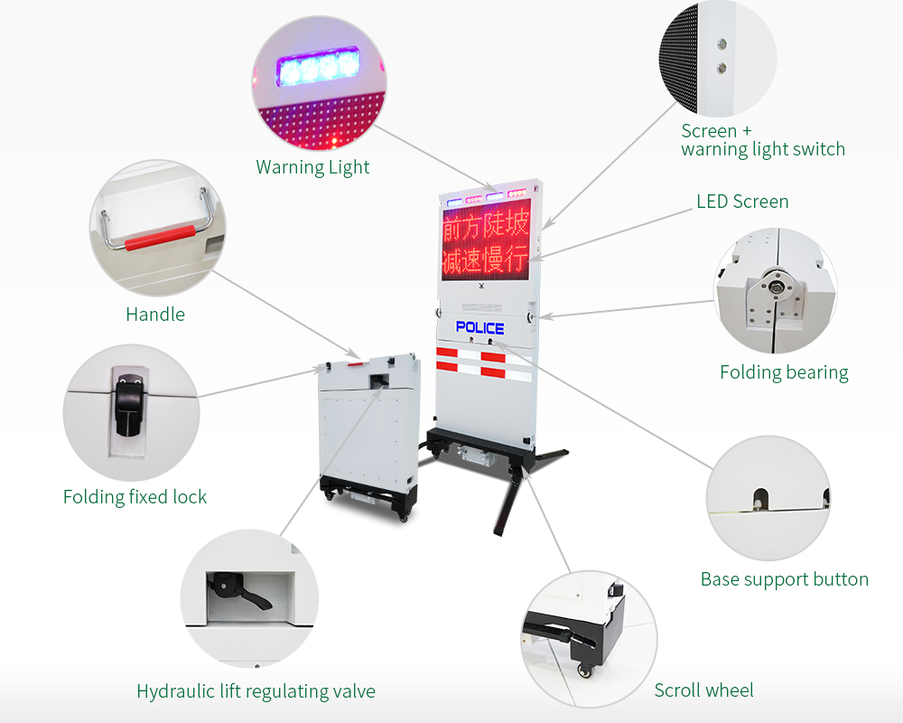 1. Yüksek parlaklık ve enerji tasarrufu: 3,2/4,2V düşük voltajlı güç kaynağı, 4535 3'ü 1 arada yüksek parlaklıkta LED'ler, parlaklık ≥ 10000CD/㎡; Parlaklık otomatik olarak ayarlanabilir; 2. HD ekran: Dinamik olarak 210 metrenin üzerinde (araç hızı 120) ve sisli havalarda statik mesafeden 250 metrenin üzerinde net bir şekilde görülebilmektedir; Araçları güvenli ve verimli bir şekilde geçmeleri konusunda uyarmak ve yönlendirmek için yol koşullarını hala yüksek çözünürlükte görüntüleyebilir; 3. Verimli ısı dağılımı: Kabinde büyük akışlı negatif basınçlı ısı dağılımı, verimli ısı tahliyesi ve LED ekranın daha kararlı çalışması; 4. Solar şarj +9.6KWH büyük kapasiteli pil, yılın 365 günü LED ekranı sürekli olarak çalıştırabilir; 5. Hidrolik kaldırma+döner yapı; Tüm ekran, bilgileri herhangi bir yükseklik ve açıda oynatmak için 1M yükseklikte ve 360 ​​° 'de gezinir. 6. Çift emniyetli çekme yapısı, 10mm emniyet zinciri, güvenli ve rahat sürükleme özelliğine sahip 80 seviyeli çekme kancası halkası. 7. 7 çekirdekli sinyal konektörü, tüm araçtaki EMARK sertifikalı römork göstergesini, fren lambasını, dönüş lambasını ve yan lambayı kontrol edebilir. 8. GPS konumlandırmayı destekleyin; U disk/cep telefonu/tablet/bilgisayar/4G/WiFi oynatmayı destekleyin; MP4/AVI/jpg/ gibi video ve resim oynatmayı destekleyin; 9. Esas olarak yüksek hızlı portal ve F çerçeveli trafik rehberliği için kullanılır; Yol onarım araçları, temizlik araçları, temizlik araçları ve diğer yol işletme araçları için güvenlik uyarı işaretleri.