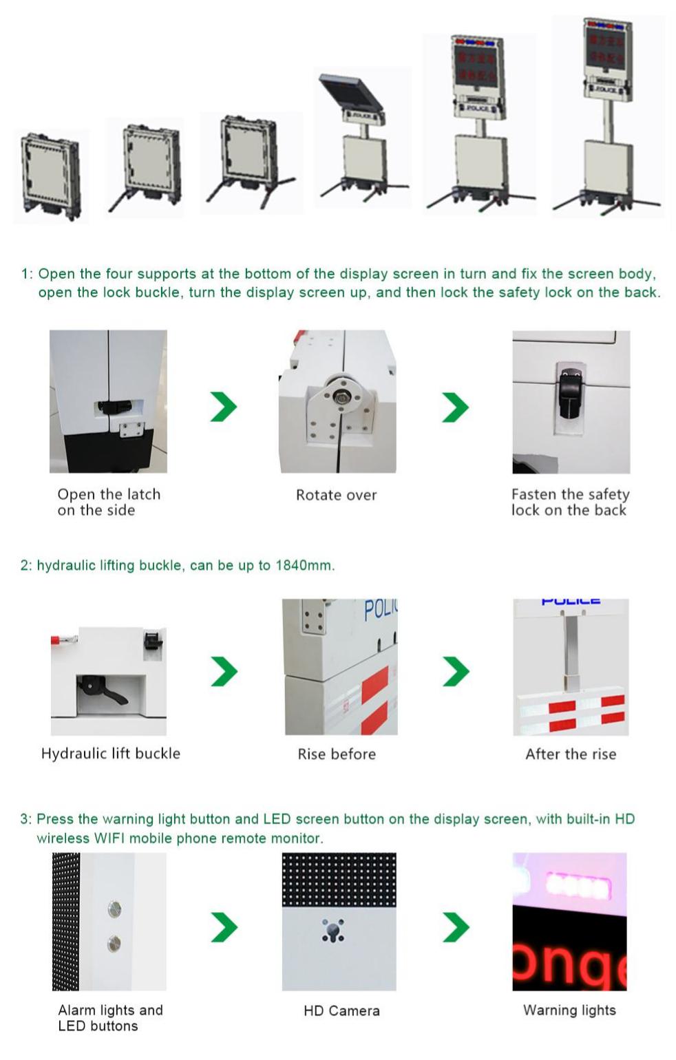Yüksek parlaklık ve enerji tasarrufu: 2,8/3,8V düşük voltajlı güç kaynağı, ICE yüksek parlaklıkta lamba, parlaklığı otomatik olarak ayarlar; HD ekran: 210 metrenin üzerinde (araç hızı 120) dinamik olarak ve 250 metreden daha uzak bir mesafeden hala açıkça görülebilmektedir. sisli havalarda statik mesafe; Hala yol koşullarını görüntüleyebilir araçları güvenli ve verimli bir şekilde geçmeleri için uyarmak ve yönlendirmek için yüksek çözünürlüklü; Verimli ısı dağıtımı: Büyük akış kabinde negatif basınçlı ısı dağıtımı, verimli ısı tahliyesi, ve LED ekranın daha kararlı çalışması; Solar şarj+9,6KWH büyük kapasite LED ekranı yılın 365 günü sürekli olarak çalıştırabilen pil; Hidrolik kaldırma+döner yapı; Bilgileri herhangi bir yükseklikte oynatmak için ekranın tamamı 1M yükseklikte ve 360 ​​° 'de gezinir ve açı. Çift emniyetli çekme yapısı, 10mm emniyet zincir, güvenli ve rahat sürükleme özelliğine sahip 80 seviyeli çekme kancası halkası. 7 çekirdekli sinyal konnektörü EMARK'ı kontrol edebilir Sertifikalı römork göstergesi, fren lambası, dönüş lambası ve yan lamba tüm araç. GPS konumlandırmayı destekleyin; Destek U disk/cep telefonu/tablet/bilgisayar/4G/WiFi oynatma; Video ve resim desteği MP4/AVI/jpg/ gibi oynatma; Genellikle yüksek hızlı portal için kullanılır ve F çerçeve trafik rehberliği; Yol tamir araçlarına yönelik güvenlik uyarı levhaları, temizlik araçları, temizlik araçları ve diğer yol operasyon araçları.