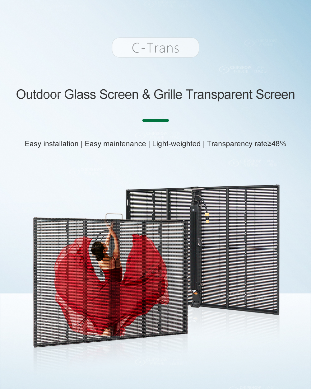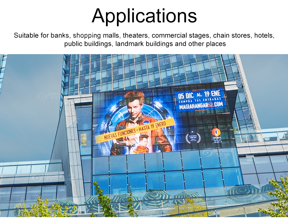 2 Yüksek şeffaflık: Ekranın şeffaflığı %48'den fazladır; ekran bir cam duvara monte edildiğinde gerçekçi bir video duvarına dönüşür; ve yine de şeffaf LED ekran sayesinde dışarıyı net bir şekilde görebilirsiniz;