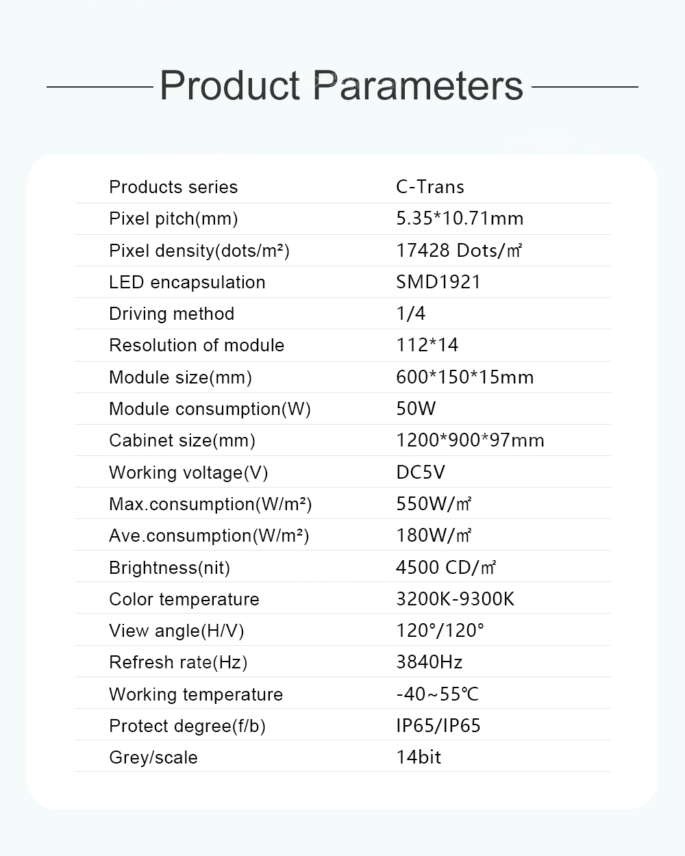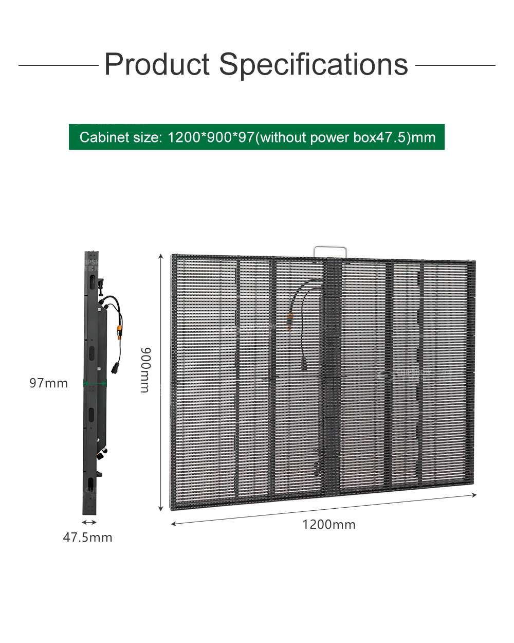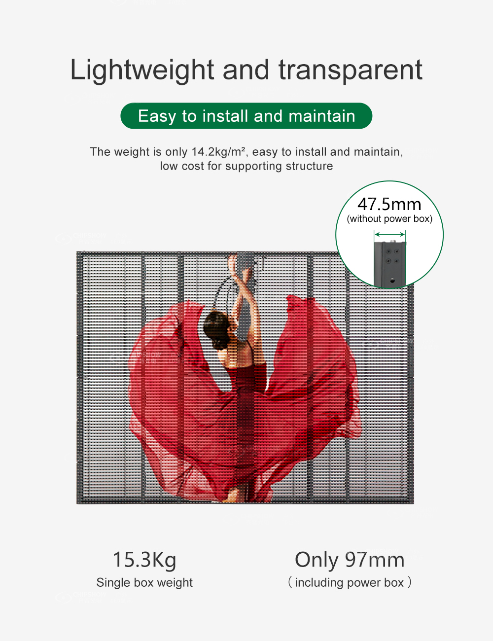 1 Hafif: ağırlık yalnızca 14,2 kg/㎡, ekranın ağırlığı yalnızca 15,3 kg (güç kutusu olmadan kabin kalınlığı: 47,5 mm, güç kutusuyla birlikte kabin kalınlığı: 97 mm),