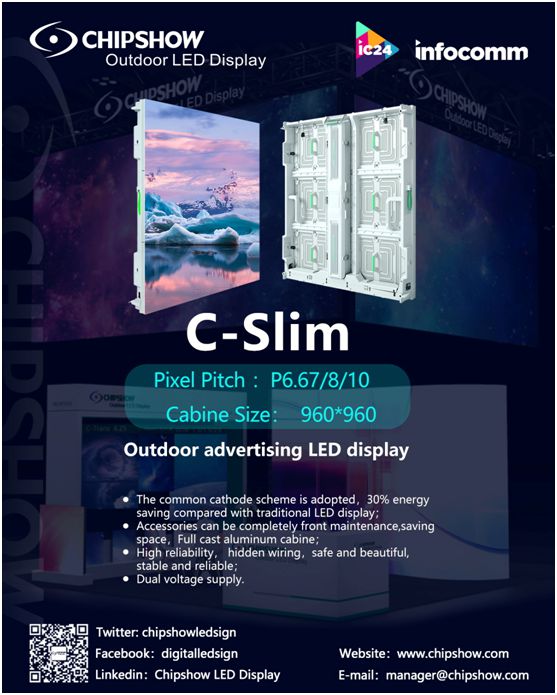 Chipshow, en popüler ve yükseltilmiş LED ekran serilerinden biri olan C-Slim'i sergileyecek . 3D LED asma duvar kullanılan C-Slim ekran bulunacaktır. 3D ekran, şu anda tüm dünyada reklamcılık çözümlerinde lider ve en çok aranan LED ekran çözümleridir.