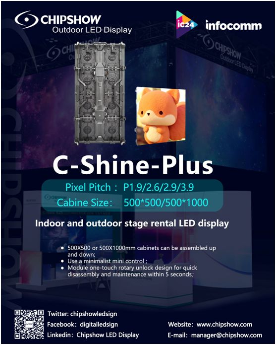 Chipshow yakın zamanda C-Shine-Plus'ı (İç ve Dış Mekan Sahne Kiralama LED Ekranı) geliştirdi. Chipshow, yüksek parlaklık, iyi görüntü efekti, enerji tasarrufu, hafiflik, bakımın basitleştirilmesi ve çarpıcı görüntü kalitesi gibi en çok talep edilen özellikleri sunuyor.
