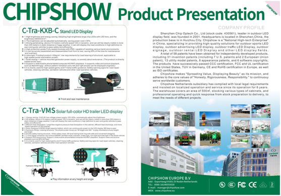 Chipshow, gelişmiş ve fütüristik trafik LED ekran çözümlerinden bazılarını (C-Tra-KXB-C, C-Tra-VMS, C-Slim, C-Tra-VMS) sergileyecek.