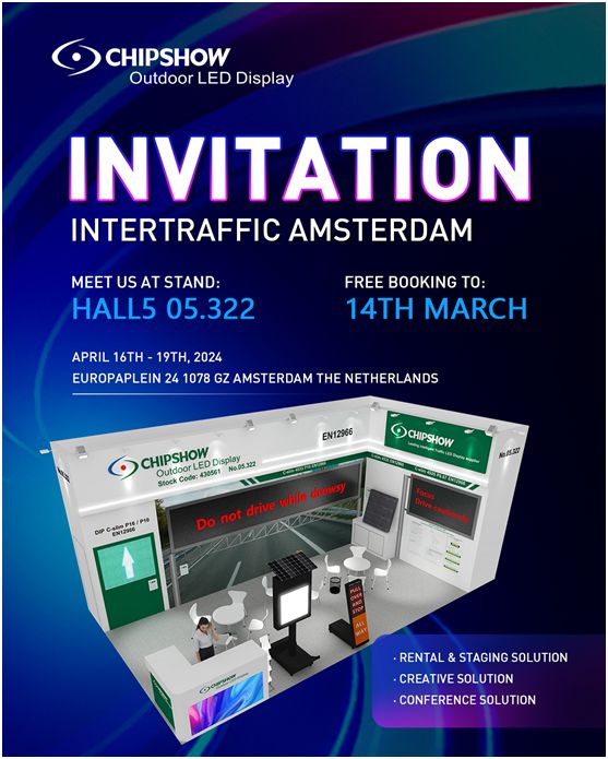 Çin'in önde gelen LED ekran üreticilerinden biri olan Chipshow LED Display, 16 Nisan - 2024 tarihleri arasında Inter-Traffic Amsterdam Hollanda ITA 2024'te tüm ürün yelpazesini (Dış Mekan LED Ekran, Trafik işaretleri, VMS) fütüristik trafik LED ekran çözümlerini sergileyeceklerini duyurdu. 19 Nisan 2024. Stand No: Salon 5, 05.322.