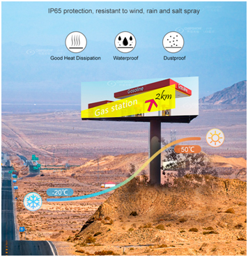 Çoğu LED ekran, mesajın normal geleneksel tabelalardan veya reklam panolarından daha uzak bir mesafeden görülmesini sağlayan geniş açılı bir mercek kullanır. Sonuç olarak, tek bir ekipmanla sürekli olarak daha fazla kişiyle iletişim kurabilmenin avantajını elde edebilirsiniz.